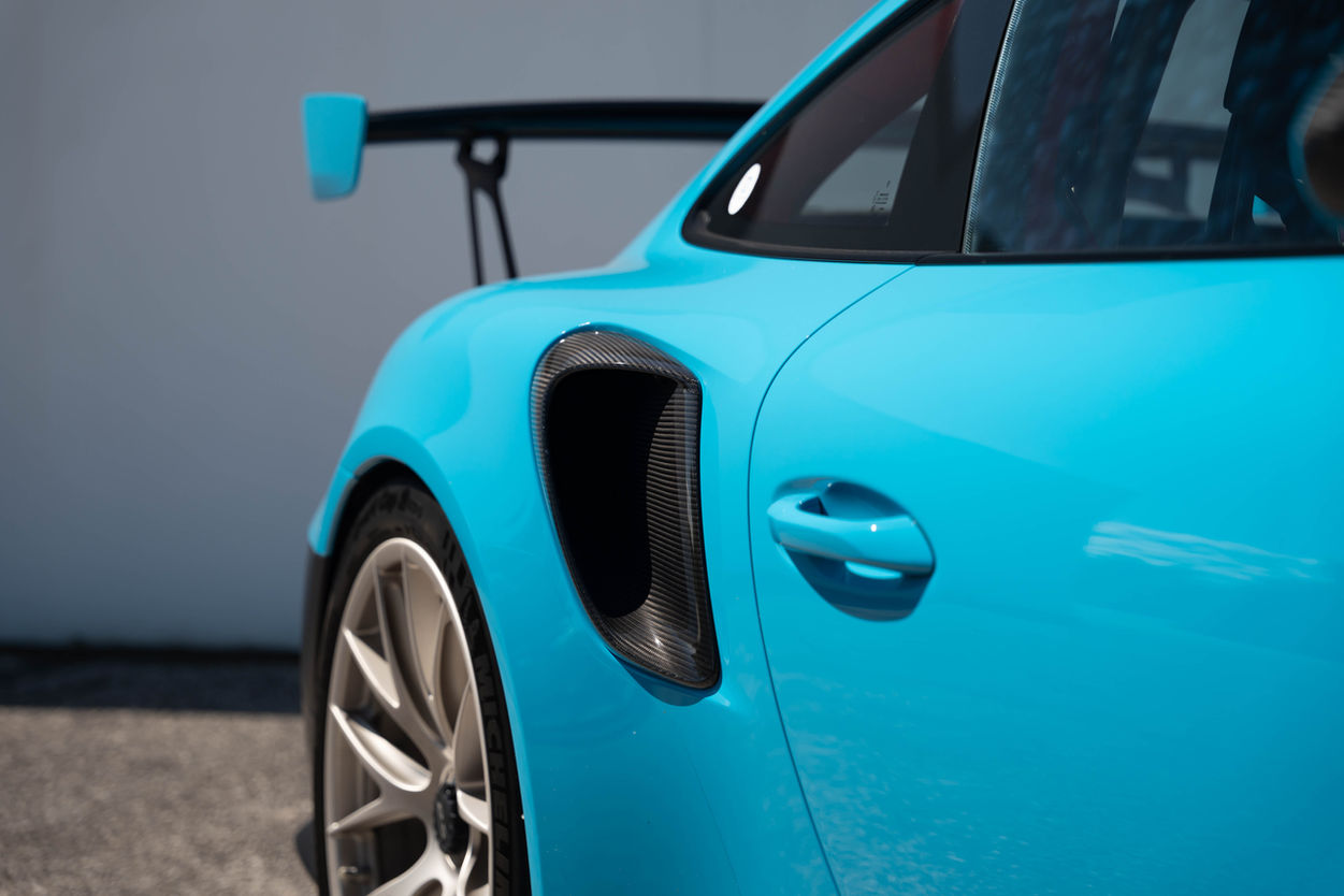 Dévoilée en 2017, le modèle GT2 RS est l'aboutissement ultime de la 911 type 991. Cette grande sœur de la GT3 RS, se positionne comme la plus extrême et puissante des 911 homologuées pour la route avec son moteur turbocompressé associé à la propulsion, une voiture particulièrement exigeante et gratifiante à piloter. Cette auto est un véritable concentré d'innovations, soulignée entre autres par son aileron actif optimisant l'appui à haute vitesse, les roues arrières directrices, les freins céramique PCCB... Elle est dotée d'un châssis ultraléger grâce à l'utilisation de matériaux comme le carbone et le magnésium, permettant de réduire son poids à seulement 1470 kg à vide. Le flat 6 3.8L bi-turbo est ici associé à la boîte PDK à double embrayage, l'ensemble impressionne par ses performances vertigineuses. Porsche est resté fidèle à sa recette de base, avec deux turbocompresseurs à géométrie variable, mais le bond par rapport aux 911 de pointe est énorme: +50 Nm et +80 ch par rapport à la 997 GT2 RS, +120 ch par rapport à la 991 Turbo S contemporaine : grâce à ses 700 chevaux et 750 Nm de couple, elle abat le 0 à 100 km/h en seulement 2,8 secondes et peut atteindre une vitesse maximale de 340 km/h. Son rapport poids/puissance de 2,1kg/ch est équivalent à celui de la Porsche 918 Spyder! Sur le circuit du Nürburgring, elle surclasse les Ferrari, Lamborghini et autres McLaren (malgré leurs V8, V10 ou V12) et signe un chrono de 6 minutes et 47 secondes, un record pour une voiture de série à l'époque.